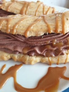 A csokis eckler-fánk tortakrém-express-l töltve és karamell öntettel megcsorgatva.