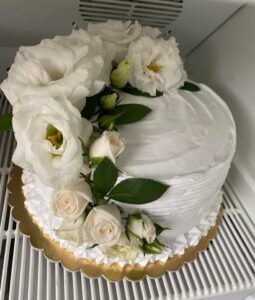 A hozzávaló piskóta Dia-Wellness piskótaporból készült. Egy gáz tepsiben sütöttem aztán kör alakúra vágtam, amilyen