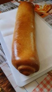Elkészítés: Lágy tésztát dagasztok, hagyom duplájára kelni. Kinyújtom téglalap alapúra, szép vékonyra. Megkenem a töltelékkel, a két szélét behajtom, feltekerem. Pihentetem 20 percet. A tetejét tojással lekenem, megszúrkálom az aljáig a tésztát. Előmelegített sütőben 180 fokon légkeverésen pirosra sütöm.