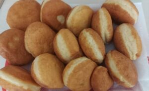 Az olajat közepesen felforrósítjuk, ne legyen túl forró, mert akkor megégnek a fánkok, a közepe pedig nem sül át rendesen!