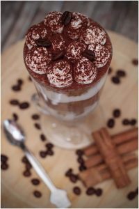 Elkezdtem rétegezni a krémet tetszés szerint felváltva és közéjük cappucinoba forgatott piskóta kockákat tettem. A tetejét tejszínhabbal és kakaóporral díszítettem.