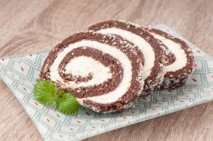 - A tésztalapokat a vajkrémmel egyenletesen megkenjük, folpack segítségével a hosszabbik oldaluk felől szorosan felcsavarjuk.