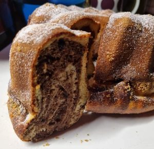 Kivajazott, zsemlemorzsával szórt kuglóf formába öntöm a masszát. Előmelegített formában 180 fokon tűpróbáig sütöm.