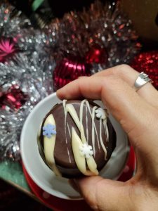 A fehér csokit ugyanúgy felolvasztjuk és díszítjük vele a csokibombát.