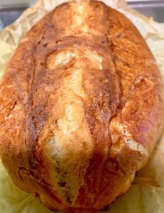 Dagasztás után 40 percenként hajtogatjuk 3-szor. Utolsó hajtogatás után 1 órát pihentetjük. Nálam egy éjszakát formában pihent a hűtőben. Reggel mintáztam, lekentem. Hideg sütőbe tettem és lefedve 45 percig 230 fokon sütöttem, majd a fedőt levéve 180 fokon még további 20 percet.