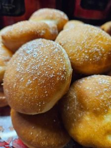 Elkészítés: A tésztát begyúrtam, duplájára kelesztettem. Kinyújtottam 1 cm vastagra, majd félbe hajtottam és újra átnyújtottam 1,5-2 cm vastagra. Nagyobb formával kiszaggattam. 20 percet pihentettem. A közepét ujjal benyomtam, majd bő, forró, de nem lobogó olajban kisütöttem (hogy át tudjon sülni). A tetejét lekvárral töltöttem vagy olvasztott Dia-Wellness kakaós Nassolóval bevontam. Paleok porcukor helyettesítővel kínáltam.