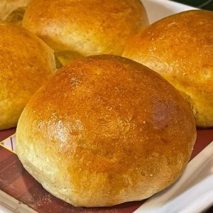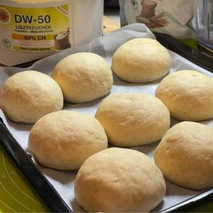 Dagasztás után egyből formáztam, utána tepsiben kb. 40 percet kelesztettem. Amíg keltek a sütőben egy lábasba vizet tettem, hogy gőz alatt süljenek majd. Egy tojássárgáját és pici tejet összekevertem, ezzel kentem a tetejét.