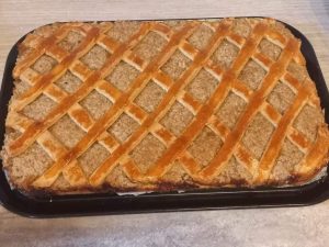 4 tojásfehérjét kemény habbá verünk. 200 gr Dia-Wellness porcukor helyettesítőt összekeverünk 250 gr darált dióval, majd óvatosan a tojásfehérje habhoz keverjük. A tésztát 2 felé vesszük. Az egyik részt vékonyra kinyújtjuk és egy 24×34 cm-es, sütőpapírral kibélelt tepsi tesszük. Villával megszurkáljuk és Dia-Wellness barack lekvárral megkenjük. Erre simítjuk a diós tölteléket. A tészta másik felét is kinyújtjuk, csíkokat vágunk és berácsozzuk a tetejét. A maradék tojássárgájával megkenjük és 180 fokon készre sütjük.