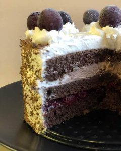 6 tojásból Dia-Wellness piskótalisztből, amihez kicsi kakaót tettem sütöttem egy tepsi piskótát. Három kis kerek lapot szúrtam ki belőle (2 egészet 2 felet, a két fél lap egy egész lesz, ha összeteszem, az lett a középső lap). A fagyasztott meggyet erithrittel felforraltam, aztán pudingot kevertem bele, ezt kihűtöttem. Tejszínt felvertem szintén az erithrittel és a lapokat megtöltöttem. 1 meggyzselé 1 tejszín. Ezután a külső részét beburkoltam tejszínnel, majd reszelt cukormentes csokival bepaníroztam. Fagyasztott meggyel dekoráltam.
