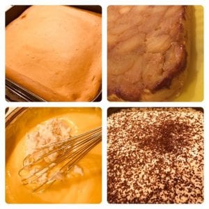 Mindent egybe mérek és habverő gyors fokozatán kihabosítom. A párolt almát kipapírozott formába rakom, hogy szépen befedje a forma alját és kihűlés után ráöntöm a piskótát. 170-180 °C-on 25 perc alatt készre sütöm. Kisülés után hagyom kihűlni, majd kiveszem a formából és visszafordítom, hogy az alma legyen felül, majd visszacsatolom köré a formát.