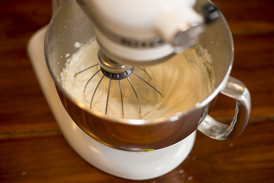 A tojásokat felverjük és hozzákeverjük a tejfölt, a mascarponét, a cukorhelyettesítőt és a lisztet.