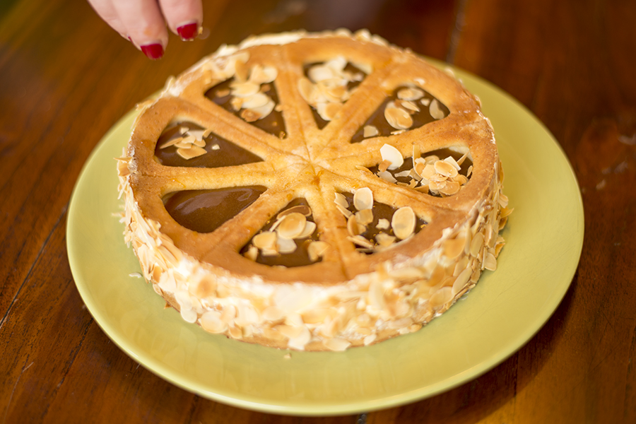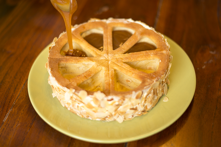 A mélyedéseket töltsük meg a karamell bevonattal és szórjuk meg pirított, szeletelt mandulával.