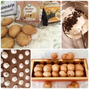 A PaleOk mandulatölteléket citromlével simára keverjük. Vegán Tojásfehérje helyettesítőt vízzel elkeverjük és habbá verjük a Dia-Wellness porcukor helyettesítővel, vigyázzunk arra, hogy ne legyen túl kemény a hab! A citromos pépbe belekeverjük a hab felét, majd rátesszük a többi habot, rászórjuk a kókusz reszeléket és a Dia-Wellness csokoládé cseppet. Az egészet nagyon óvatosan összeforgatjuk, vigyázva arra, hogy ne törjön össze a hab. Szilikonos sütőlappal bélelt sütőlemezre habzsákból kicsi halmokat nyomunk és 160 °C-ra előmelegített sütőben 30 perc alatt készre sütjük.