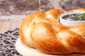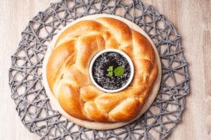 - A tészta rudakat hagyományos módon összefonjuk, a két végét összeragasztjuk, a közepébe egy kókuszolajjal megkent bögrét helyezünk, hogy a kalács kör alakja megmaradjon.
