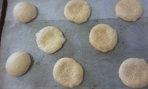 Sütőpapírral bélelt tepsibe tesszük a gombócokat, tenyérrel lelapítjuk őket, majd lekenjük tojással és megszórjuk a szezámmaggal.