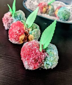 Az összetapasztott golyók egyik felèt a piros, a másik felèt a zöld folyadèkba mártjuk, majd a cukorhelyettesítőben megforgatjuk. Vègül a közepèbe szúrjuk az ostyalevelet.
