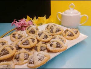 Elkészítés: A lisztet, sütőport, sót összekeverjük, majd összemorzsoljuk a felkockázott hideg vajjal. Miután kivesszük a vajat a hűtőből, kicsit kint hagyjuk a pulton, hogy azért ne legyen jéghideg, de szobahőmérsékletű sem, kicsit az alatt. Jöhet bele a 2 tojás sárgája, a kétféle cukorhelyettesítő, majd az egészet gyorsan összegyúrjuk. Fél órára betesszük a hűtőbe, majd lisztezett deszkán 3-4 mm vastagságúra nyújtjuk. 96 db 5 cm-es korongokat szaggatunk belőle és sütőpapírral bélelt tepsibe tesszük. A maradék tésztadarabokat összegyúrjuk és 96 db 6 cm hosszú rudakat sodrunk belőle. A tojásfehérjéből kemény habot készítünk, a porcukor helyettesítővel további 2 percig verjük, majd beleforgatjuk a mákot és a citromhéjat. A töltelék elkészítése után érdemes gyorsan dolgozni a sütivel, hogy ne essen össze a hab. Minden korong közepére 1 teáskanálnyi tölteléket rakunk, majd kereszt alakban mindegyik tetejére rudakat teszünk. Előmelegített 170 fokos sütőben alsó-felső módban kb 14-18 percig (sütőfüggő) sütjük.Még melegen megszórjuk porcukor helyettesítővel.