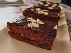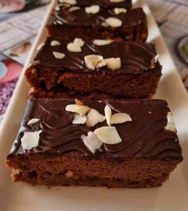 Ha kihűlt kettévágjuk és megkenjük barack lekvárral. A tetejét bevonjuk mikróban pici olajjal olvasztott nassolóval. Villával díszítjük és mandulával megszórjuk.