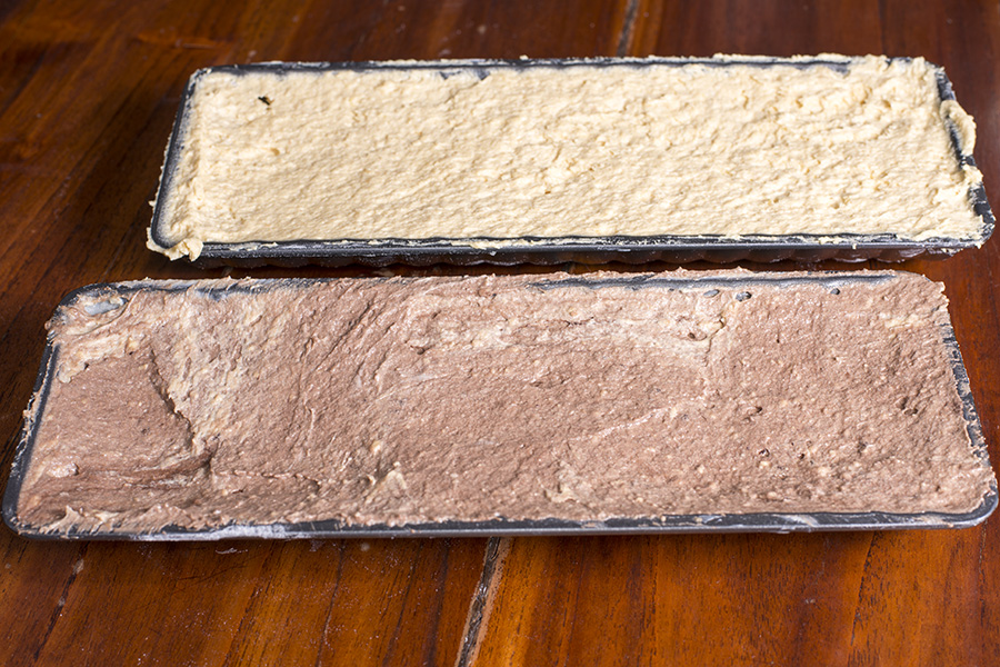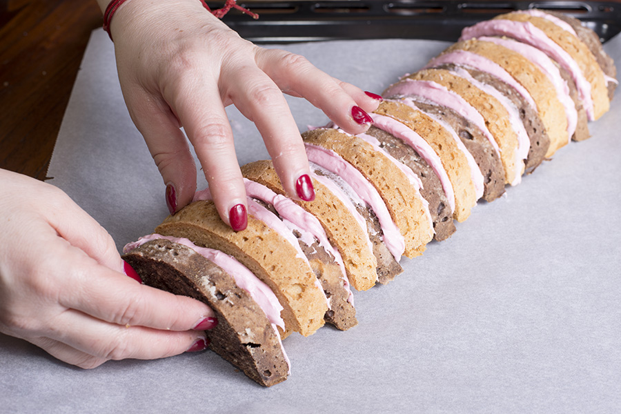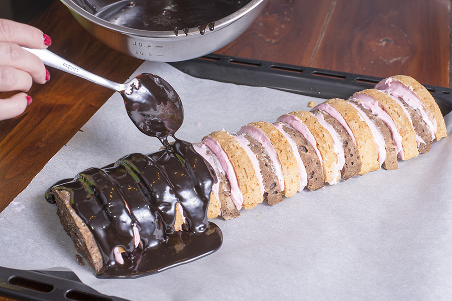 Ezzel ragasztjuk (kenjük) össze a tésztaszeleteket, felváltva, hogy egy hosszú, csíkos rudat kapjunk.