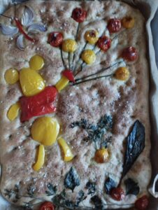 Megint pihent fél órát, és olajjal megkentem, díszítettem, durva sóval és fokhagymaporral megszórtam.