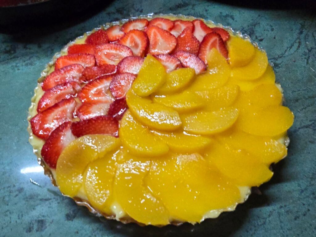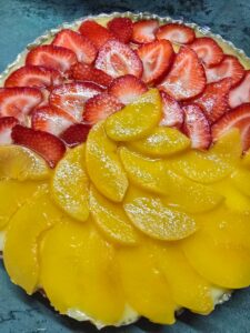 A krémhez a pudingport a vízzel kikeverem közepes sűrűségűre. A piskóta közepére kenem, majd gyümölccsel díszítem. A zselatint vízzel pici negyedannyival összemelegítem, bevonom vele a gyümölcsöt.