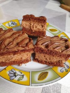 3 gr zselatint feloldottam 18 gr vízzel, visszalangyosítottam és a csokira öntöttem. Amikor langyosra hűlt kicsit felvertem, majd a felvert „tejszínt” beleforgattam.