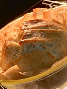 Reggel lisztezett deszkán átgyúrtam és formáztam. Sütőpapírral bélelt jénaiba tettem 4 helyen bevágtam és letakarva még félórát kelesztettem. Aztán vízzel lekentem, a jénai tetőt is benedvesítettem és hideg sütőbe tettem, majd 220 fokon lefedve 50 percet sütöttem. A jénai tetőt levettem és vízzel átkenve 180 fokon további 15 percet sütöttem.