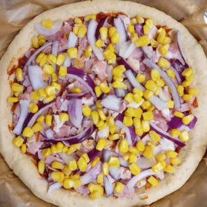 Én pizza fűszerkeverékkel elkevert sűrített paradicsommal kentem meg, feltétek nálam: szalámi, bacon, sonka, lilahagyma, kukorica és light mozzarella sajt a tetején. 220 fokra előmelegített sütőben megsütöttem.