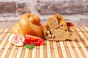 - A tésztalapokat ez után egyenként széthúzzuk a kezünkkel úgy, hogy a hosszúkás, ovális alak megmaradjon és feltekerjük úgy, hogy a sonkakrémet mindenhol fedje be a tészta. A széleit csípjük össze, majd sodorjuk belőle kb. 35 cm hosszú rudakat. Az egyik végétől csiga formára – ne túl szorosan – csavarjuk fel, majd a szabadon maradt végét nyomjuk össze két ujjunk között, hajtsuk a briós alá és alulról nyomjuk bele a briós közepébe. Így sütés közben egyben marad a briós és a közepe szépen kiemelkedik.