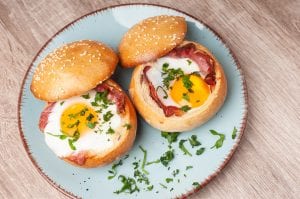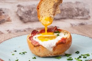 - A zsemlék tetejét levágjuk (ügyeljünk rá, hogy mindenképp egyenesen, nehogy kifolyhasson belőle a tojás!).