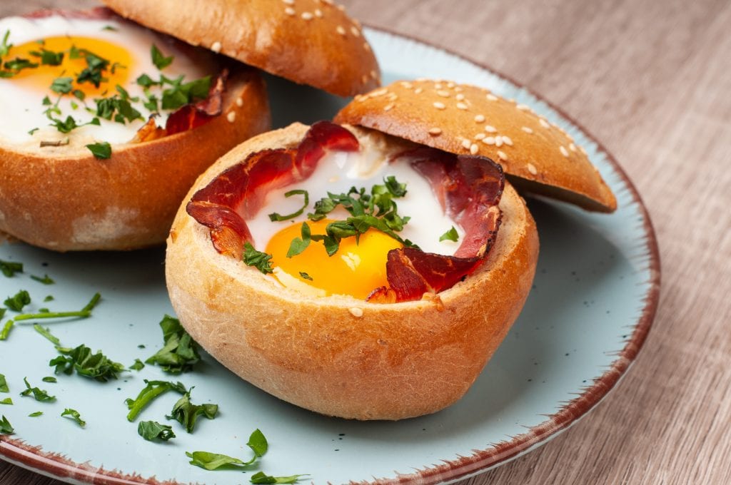 - Mindegyik szelet sonka közepét bemetsszük X alakban, és kicsit megnyomkodva kibéleljük vele a zsemle belsejét. (Azért kell a bemetszés, mert így a tojás a zsemle belseje felé fog folyni, és nem ki, a tepsire.)