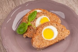 - Hosszúkás, lapos kenyér alakúra formázzuk, majd egymás mellé rárakjuk a kemény tojásokat.