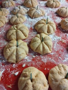 Lisztezett lapon rudakat formáztam, darabokra vágtam, a darabokból golyókat csináltam.