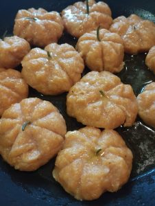 Kb. 30 dkg sült sütőtököt lepürésítettem, kihűtöttem, kb. 25 dkg Dia-Wellness sütőliszttel, egy egész tojással, sóval, őrölt borssal összegyúrtam. Lágy, de nem ragadós tészta kell.