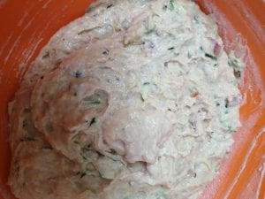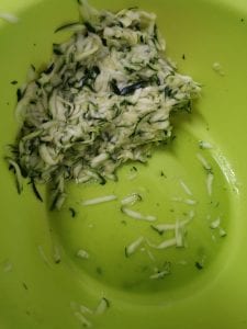 A cukkinit egyben, hámozás nélkül almareszelőn lereszeljük. Picit sózzuk, majd pihentetjük.