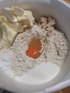 A tészta hozzávalóit beteszem 1 dagasztó tálba és jó alaposan kidagasztom.