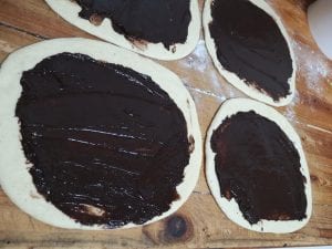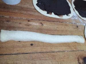 Nyújtsátok ki kb. 3mm vastagra, és a csokis tölteléket kenjétek rá, nem kell hogy vastag legyen. A kevesebb néha több ?