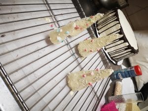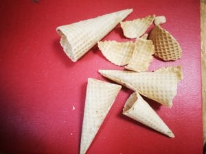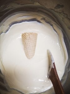 Közben a fehér csokit is oda teszem vízgőz fölé, majd az egyenesre vágott tölcsért bele mártom, és meg szórom színes cukorka disszel.