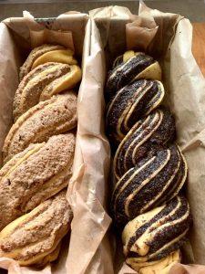 Felfőztem és kihűlés után tettem bele a rumaromában áztatott mazsolát és 3 ek cukormentes meggylekvárt és néhány szem meggyet (ez utóbbi elhagyható). A darált dió esetében is így járok el, de 3 evőkanál cukormentes sárgabarack lekvár kerül bele. Kelesztés után ketté vettem a tésztát és hosszúkás téglalap alakúra nyújtottam és a tölteléket elegyengettem rajta, majd a hosszabb oldalon feltekertem és hosszában ketté vágtam. Keresztbe tettem egymásra és összefontam, a formába tettem sütőpapírra. Félóra pihentetés után tojás es tej keverékkel lekentem és előmelegített sütőben 180 fokon 45 perc alatt készre sütöttem. Még melegen lekentem almasziruppal (paleo) és szép fénye lett.