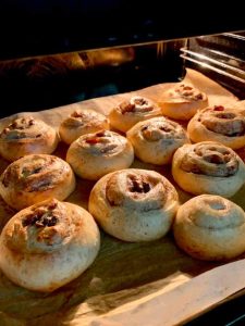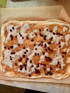 20 dkg Dia-Wellness -50 liszt és 5 dkg Dia-Wellness zero 6 koncentrátum összekeverve 1 tk szódabikarbónával, 25 dkg krémes tehéntúróval, 50-60 gr skyrrel (ha nincs ugyanannyi folyós, de nem meleg vajjal vagy margarinnal), 0,4 dl mandulatejjel (bármilyen más tejjel jó lesz) és 30 gr Dia-Wellness 1:4 cukorhelyettesítővel (én most 4 ek Szűrt Almacukorral) készítettem. Összedolgoztam, nyújtottam, majd skyrrel kentem le, erre ment a fahéj-negyedannyi keveréke és egy kis sütőrumban áztatott mazsola. Feltekerés után, daraboltam és a tepsiben kentem le felvert tojással. Kb. 15-18 percig sütöm előmelegített sütőben, 150 fokon légkeverésen.