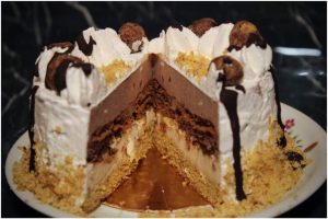 Tetején piskótából és dióból+pudingból gyúrt golyók.