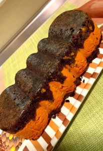 A kihűlt sütőtököt aprítóban teszem a fűszerekkel és összezúzom, amennyire lehet. Az alaptésztához a vajat a cukorpótlóval összekeverem, majd a tojásokkal kihabosítom, végül a sütőporos liszttel elegyítem. A tészta egyik felét az aprítóban teszem a tök mellé és összezúzom benne. A maradék tésztába keverem a kakaót és a csokicseppeket. Tupperware formába simítom a csokis tészta felét, majd ráteszem a sütőtökös részt, legvégén a másik csokis részt darabokban teszem rá és mintát formázok. Előmelegített sütőben 180 fokon 30 perc alatt elkészül.