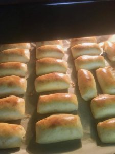 A zserbó töltelékhez a darált diót Dia-Wellness sárgabarack lekvárral elkevertem a sütőrumban áztatott mazsolával ízesítettem. A tésztát összeállítottam, majd nyújtottam és felvágtam, töltöttem és sütés előtt felvert tojással kentem le. Előmelegített sütőben 180 fokon sütöttem. Mire szép színe lesz, meg is sült.