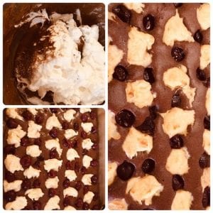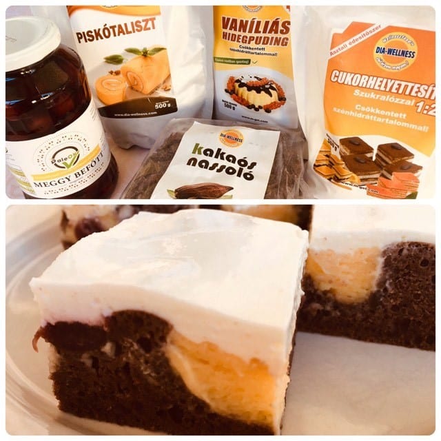 Tejet és a Dia-Wellness Vaníliás hidegpuding-port elkeverjük, hozzá adjuk a tojások sárgáját és kiskanállal a kakaós tésztánkra kanalazzuk szépen elrendezve. PaleOK Meggy befőttet lecsöpögtetjük és ezt is a kakaós tésztára rendezzük. Az így elkészített terméket 175 oC on készre sütjük.