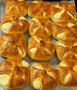 Megtöltöm a túrós töltelékkel. A tetejét tojássárgájával lekenem. 170-180 fokon sütöm.