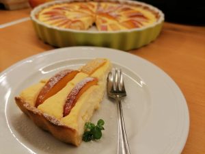 A tésztát megszurkáljuk, alufóliával kibéleljük.és egy nagy adag lencsét szórunk bele. Kb 12 percig sütjük,majd lencse nélkül újabb 8 percig. A krémhez összekeverjük a hozzávalókat, kivéve a nektarint. A nektarint felszeleteljük és körbe belenyomkodjuk a krémbe. A pitét visszatesszük a sütőbe és még kb. 20 percig sütjük.