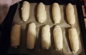 Bedagasztom, 15 perc pihentetés, formázom, 30 perc kelsztés.