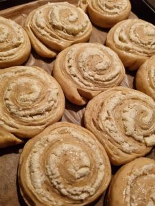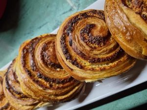 A tésztát bedagasztom, majd négy felé veszem. Téglalap alakúra nyújtom mindet. Egymásra helyezem a lapokat úgy, hogy a rétegek közé kenem a puha vajjal kevert tejfölt. Összenyújtom, majd a tetejét megkenem a kókusztöltelékkel. Feltekerem és felvágom 1,5 cm vastagságúra. 45 percig pihentetem, amíg duplájára kel. A tetejét tojással vagy tejjel lekenem. Előmelegített sütőben 180 fokon, légkeverésen pirosra sütöm.