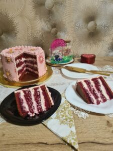 Elkészítés: A tojást kettéválasztjuk, a fehérjét 100 gr porcukor helyettesítővel kemény habbá verjük. A kefirt, olajat, ételszínezéket összekeverjük. A sárgához adjuk a porcukor helyettesítő másik felét, a vaníliáscukrot, a kefíres keveréket, majd a száraz hozzávalót, folytonos keverés mellett, majd a felvert tojásfehérjét. 2 db 20 cm tortakarikába öntjük, 160 fokon 1 óra alatt megsütjük. Málnazselé: Mindent lábasba rakunk, lekvárt főzünk.